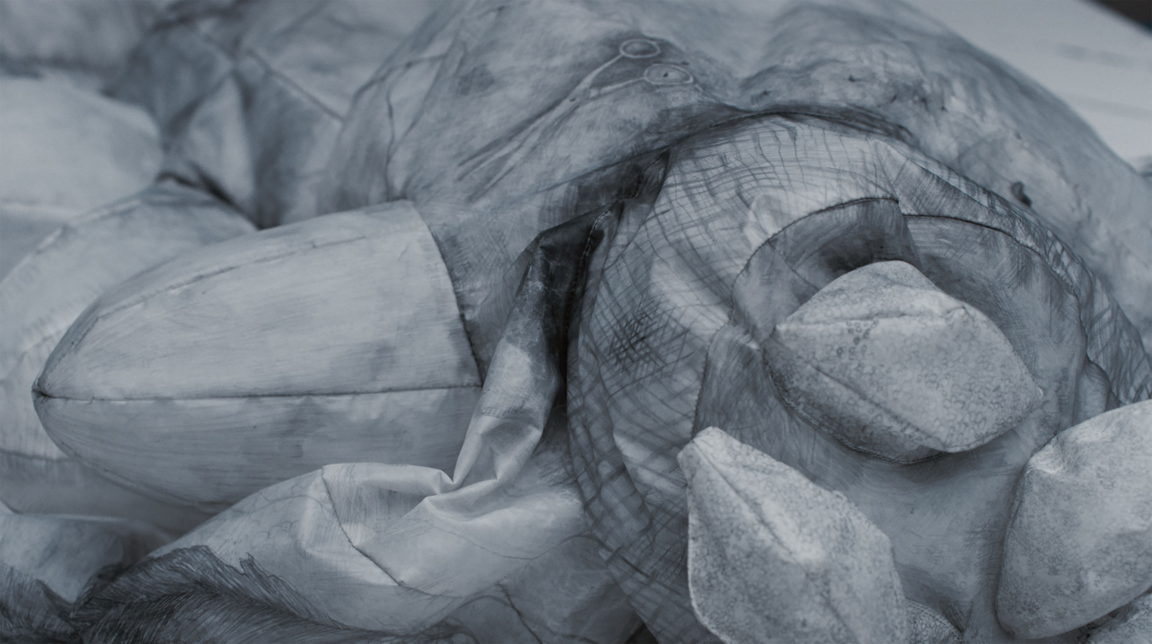 ‘At first gaze, this hyper-glitch Opera is incongruously out of time. One enters another world: meets mushrooms and corals, glass artichoke-hand grenades, the cross-section of which recur in graphic scores – cartographies that in turn provide the basis for the choreographic work. Drawings of allegorical sparrow figures are transformed into hand-painted costumes reminiscent of parachute-silk Arcimboldos during the process. Multiple reconfigurations of body and space in which words and gestures, movement and drawing, sculpture and language are ceaselessly translated into one another, into a mythological fabric in which everything is metaphorically interwoven; Bang Bang Baroque, Mao Zedong’s Sparrow War encounters traditional dance notations; Oskar Schlemmer and Klaus Nomi, Octavia Butler and Legacy Russel meet in baroque wigs for a ritual dance. A deep sigh; of relief or despair? Exhale, Deflation. Back to work. Until we glitch again, with a cocktail chalice in hand.’